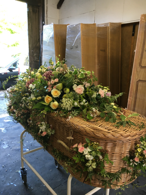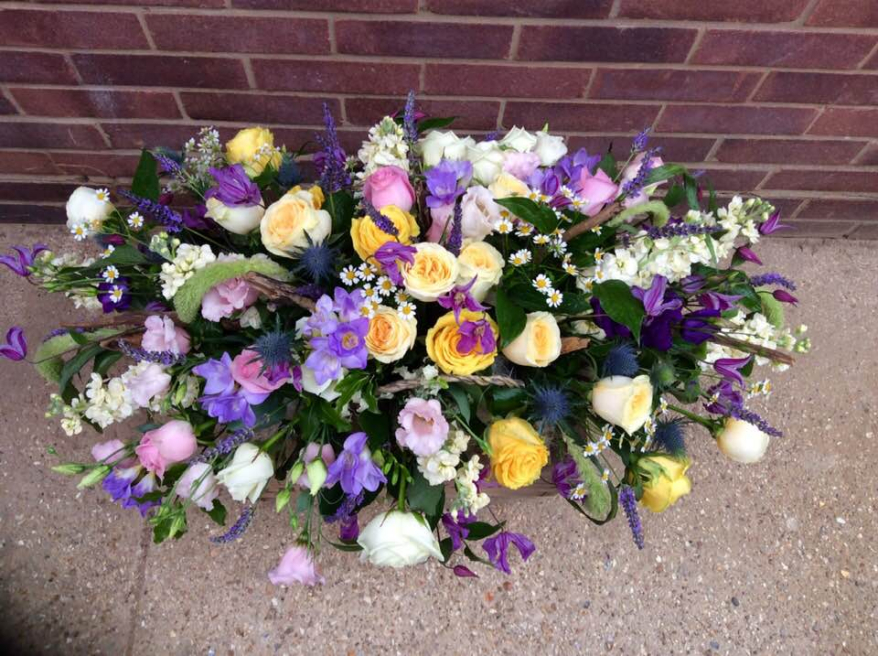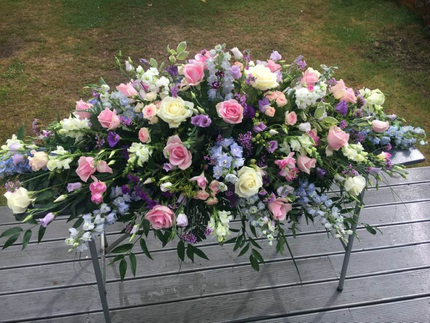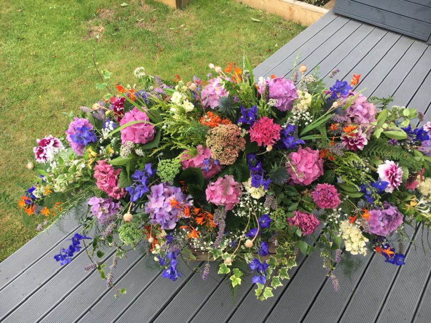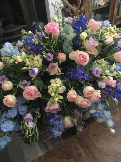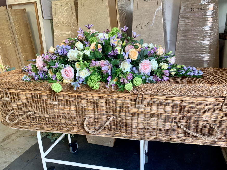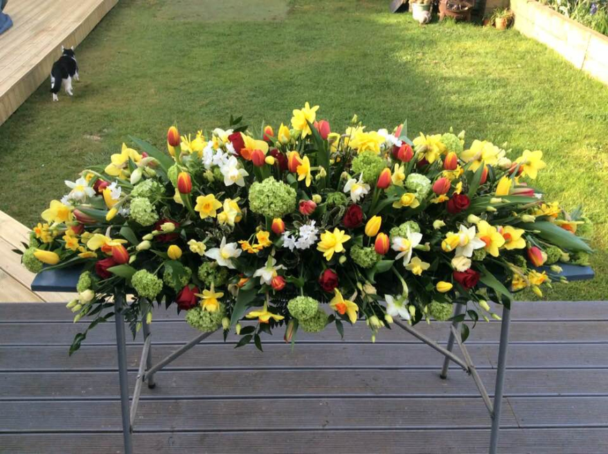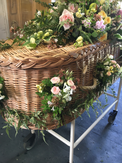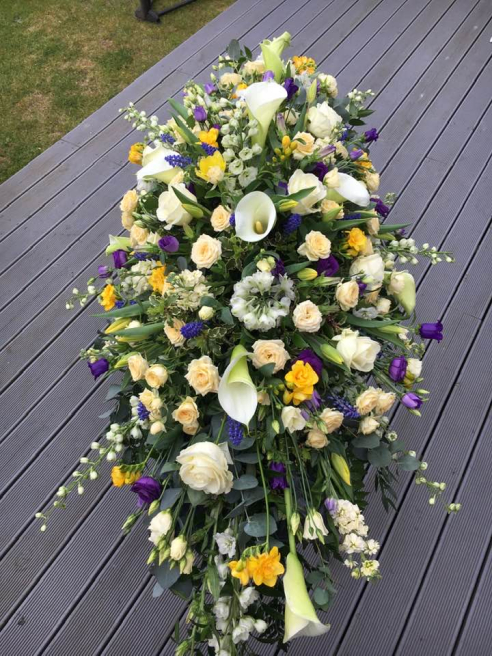 Below are a selection of tributes I have created over the years. As a guide, a length of 3–5 feet creates a beautifully balanced design, with prices starting from £50 per foot, depending on your choice of flowers. I can dress wicker coffins at their place of rest.