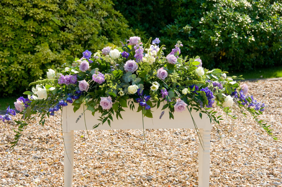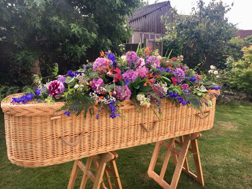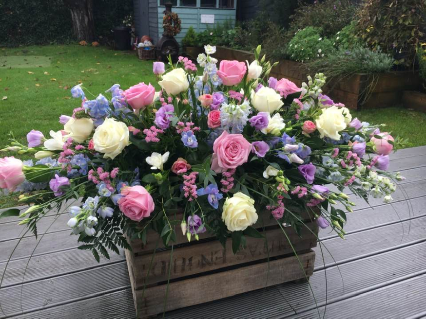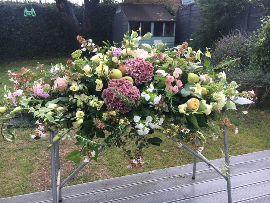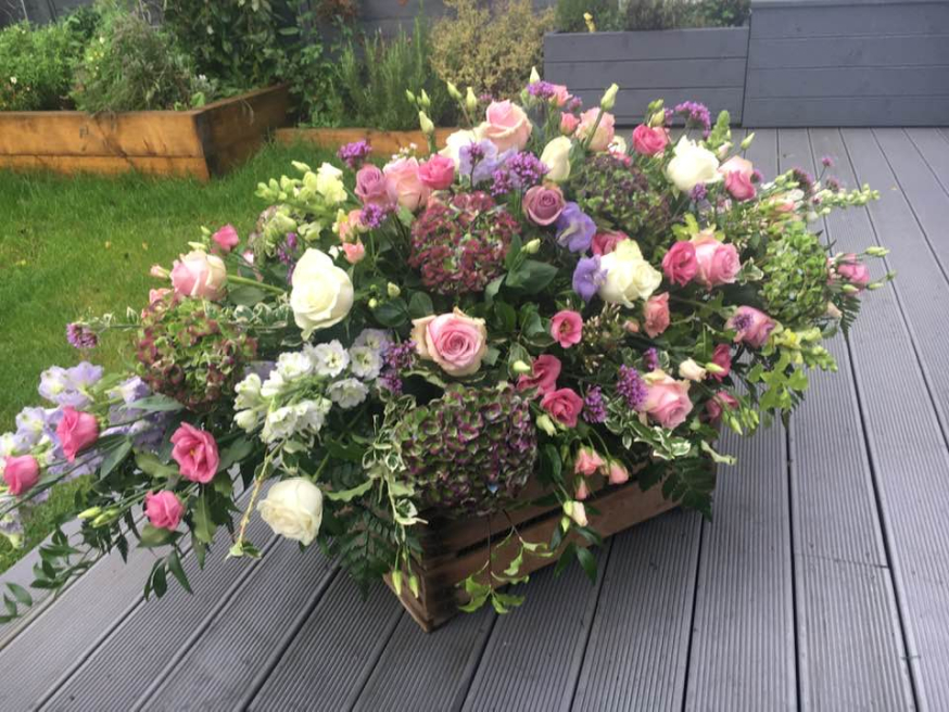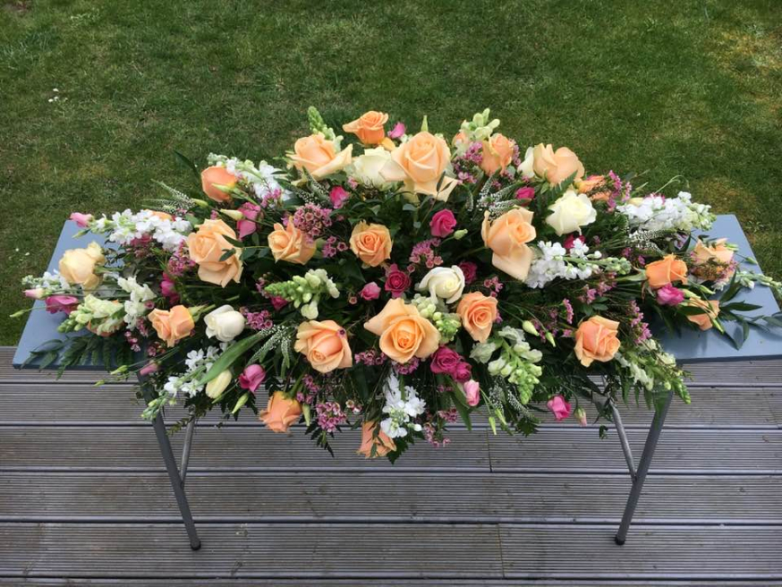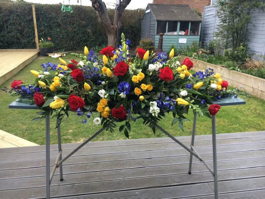 Below are a selection of tributes I have created over the years. As a guide, a length of 3–5 feet creates a beautifully balanced design, with prices starting from £50 per foot, depending on your choice of flowers. I can dress wicker coffins at their place of rest.