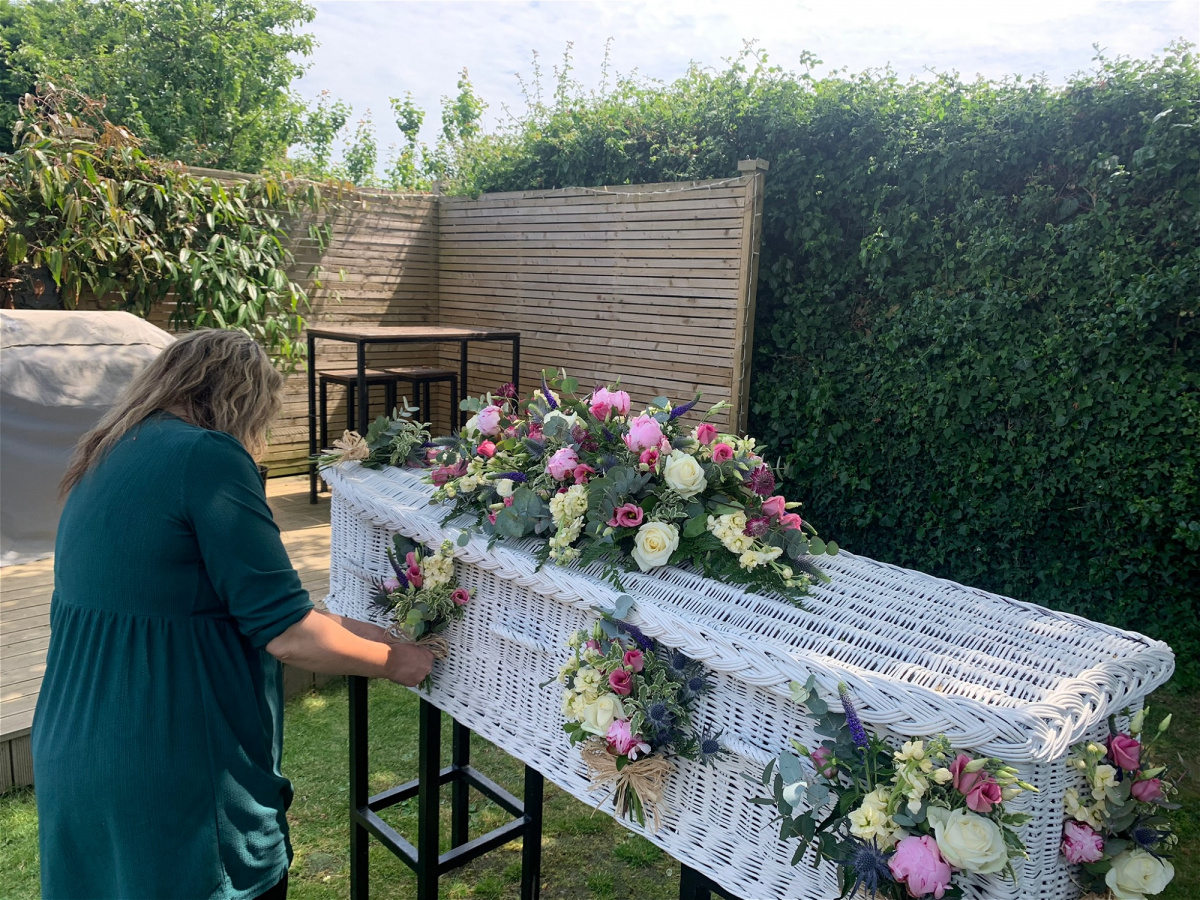 Designs: Double ended spray plus small tied posies to dress the sides of a wicker coffin.